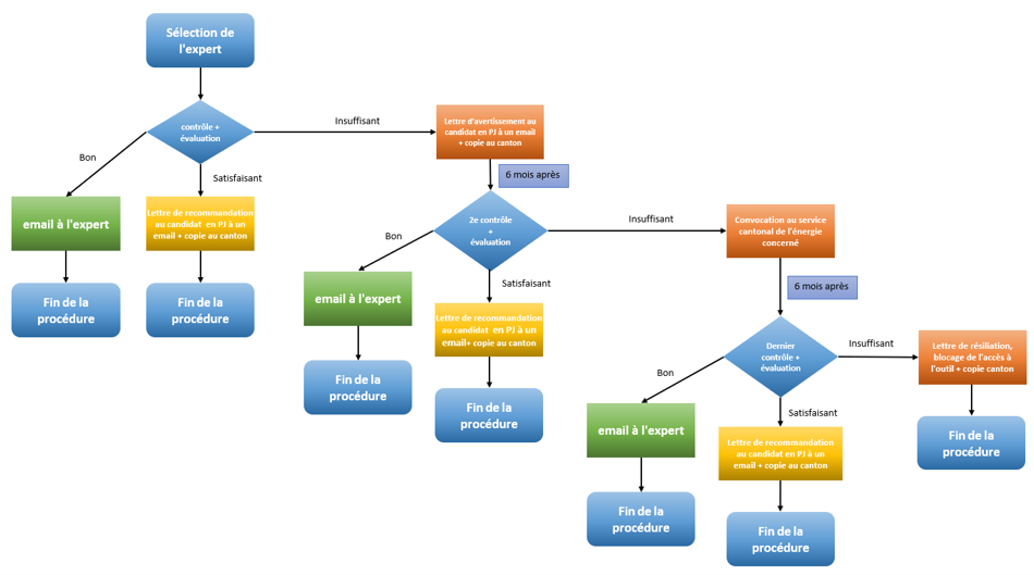 Dans ce dernier cas, les nouvelles publications de l'expert·e sont examinées dans un délai minimum de 6 mois. Si nécessaire, il·elle est convoqué·e pour une rencontre avec les responsables AQ et les représentants cantonaux de l’énergie. Lors de cette séance, des mesures visant à améliorer la qualité sont prises - il peut s'agir, par exemple, d'une formation complémentaire.