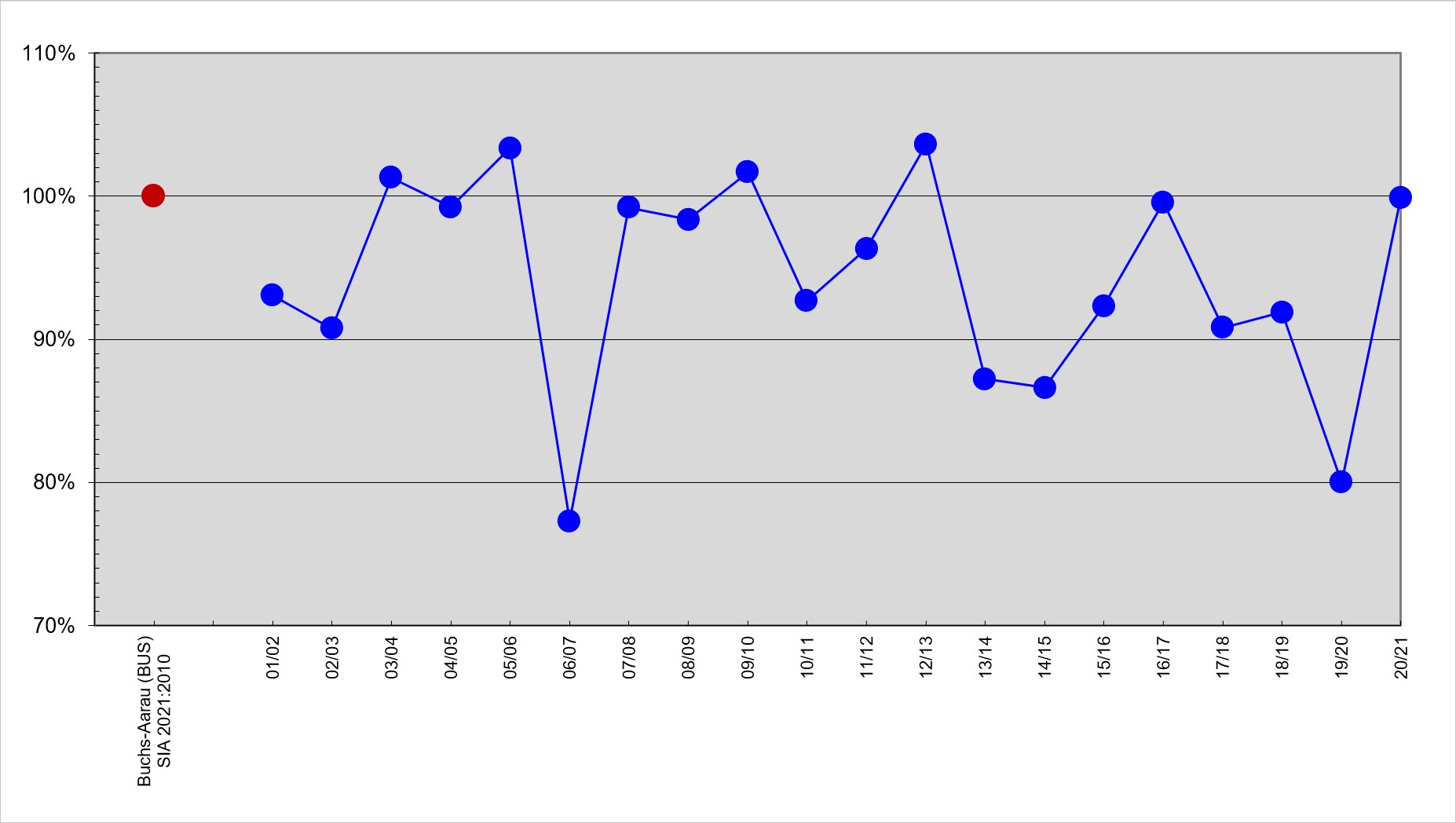 Les données des 40 stations climatiques sont basées sur la moyenne calculée sur les années 1984-2003. Comme on le sait, les dernières années ont été de plus en plus chaudes et les valeurs annuelles des degrés-jours de chauffage sont donc généralement plus faibles. Par exemple, l'écart par rapport à la moyenne à long terme est d'environ -12 % dans les trois périodes de chauffage entre 2017-2020 pour la station climatique "Buchs-Aarau".