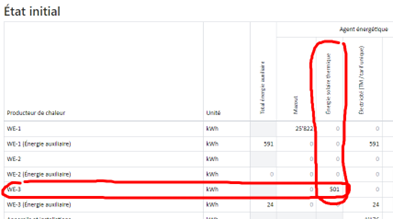 Important : pour la traçabilité, il est important de justifier la part de récupération de chaleur. Un calcul ou une estimation correspondante doit être effectué par l'expert·e CECB si rien n'est disponible. Donc dans cet exemple pour le taux de couverture de 20 %, respectivement les 501 kWh de WE-3.