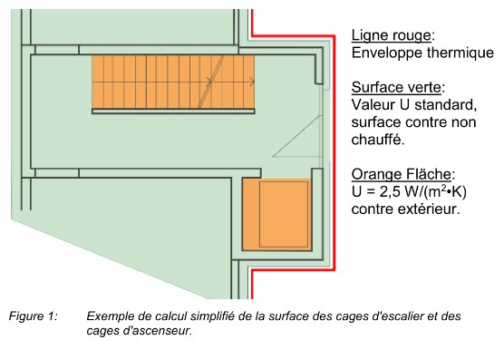 Les autres surfaces (paliers, surfaces de dégagement, accès, plafonds, etc.) doivent être indiquées avec les valeurs U correspondantes.Cas C : Cage d'escalier en dehors du périmètre d'isolationLes exigences normales contre non chauffé s'appliquent : toutes les surfaces de l'enveloppe du bâtiment et les valeurs U correspondantes doivent être indiquées et prises en compte en conséquence (SIA 380/1:260 annexe C.2).ConclusionLe critère essentiel pour savoir si la simplification peut être appliquée ou non est celui de la "cage d'escalier fermée". Une cage d'escalier est considérée comme fermée lorsqu'elle comporte des portes donnant sur les pièces d'habitation et de travail. -